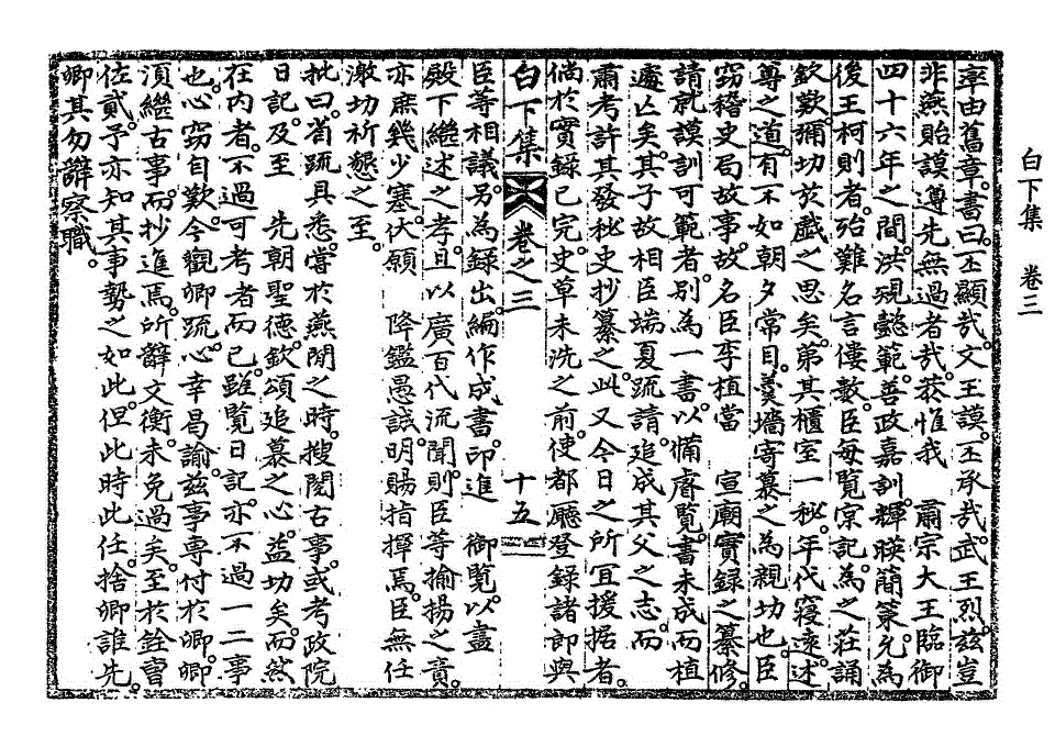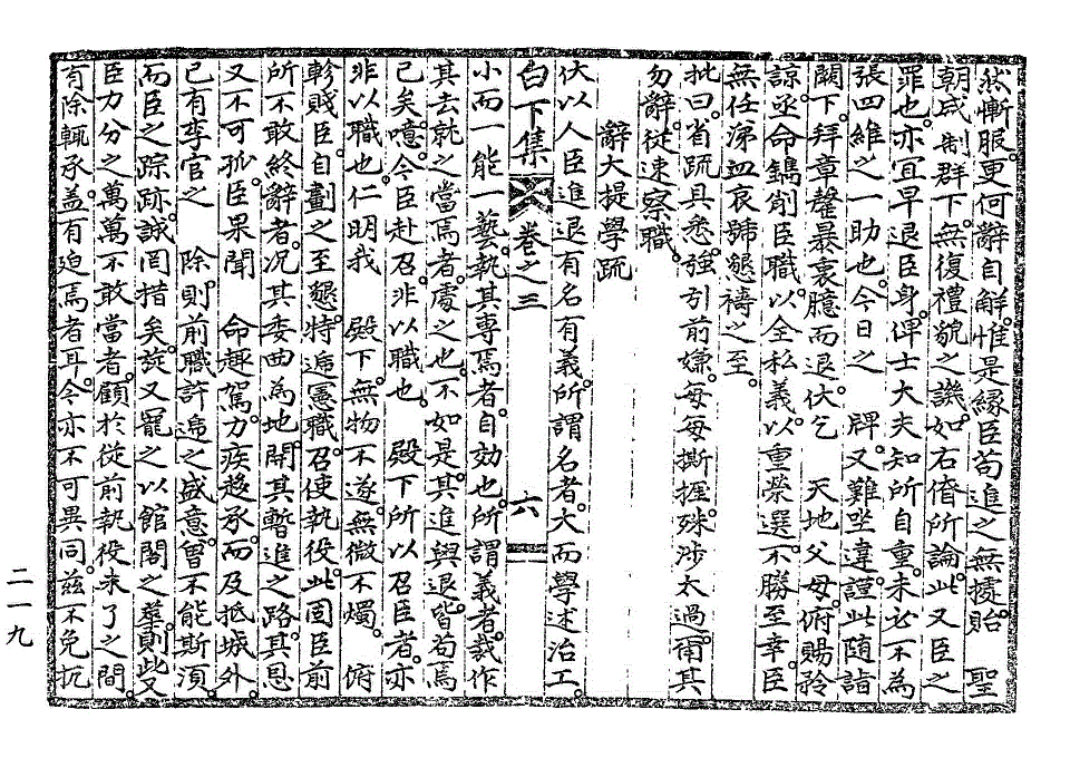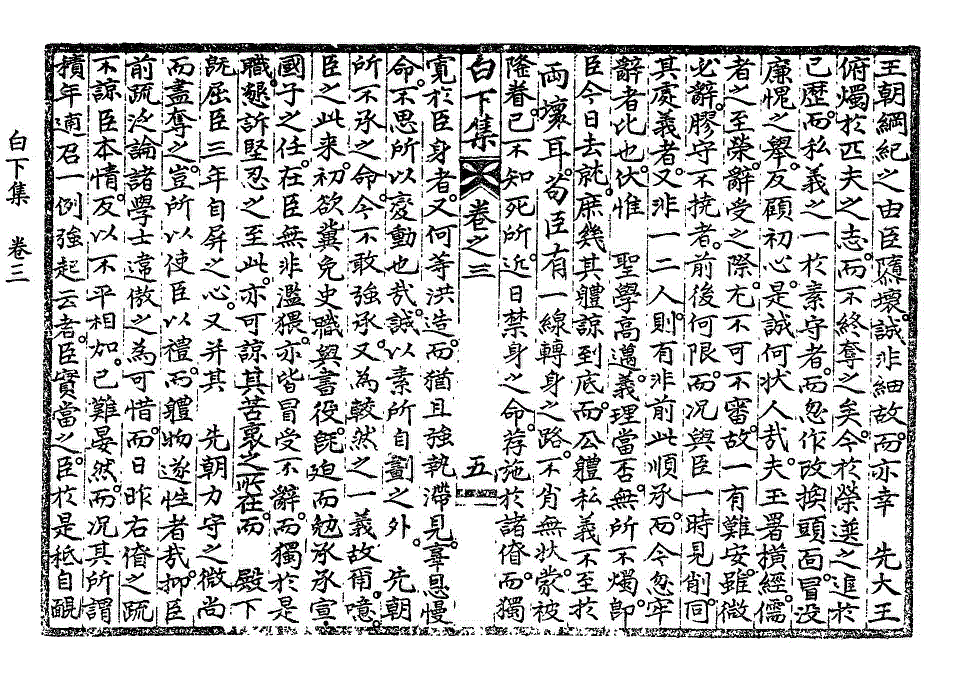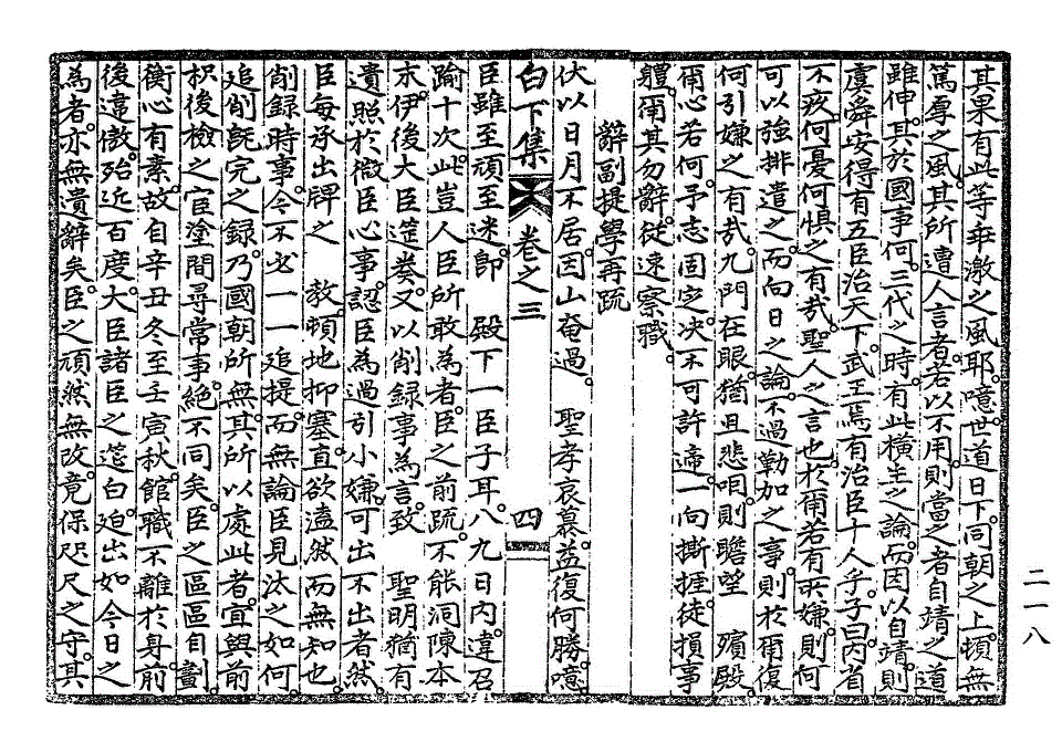 王朝纲纪之由臣隳坏。诚非细故。而亦幸 先大王俯烛于匹夫之志。而不终夺之矣。今于荣选之进于已历。而私义之一于素守者。而忽作改换头面。冒没廉愧之举。反顾初心。是诚何状人哉。夫玉署横经。儒者之至荣。辞受之际。尤不可不审。故一有难安。虽微必辞。胶守不挠者。前后何限。而况与臣一时见削。同其处义者。又非一二人。则有非前此顺承。而今忽牢辞者比也。伏惟 圣学高迈。义理当否。无所不烛。即臣今日去就。庶几其体谅到底。而公体私义不至于两坏耳。苟臣有一线转身之路。不肖无状。蒙被隆眷。已不知死所。近日禁身之命。荐施于诸僚。而独宽于臣身者。又何等洪造。而犹且强执滞见。辜恩慢命。不思所以变动也哉。诚以素所自划之外。 先朝所不承之命。今不敢强承。又为较然之一义故尔。噫。臣之此来。初欲冀免史职与书役。既迫而勉承承宣,国子之任。在臣无非滥猥。亦皆冒受不辞。而独于是职。恳诉坚忍之至此。亦可谅其苦衷之所在。而 殿下既屈臣三年自屏之心。又并其 先朝力守之微尚而尽夺之。岂所以使臣以礼。而体物遂性者哉。抑臣前疏泛论诸学士违傲之为可惜。而日昨右僚之疏不谅臣本情。反以不平相加。已难晏然。而况其所谓积年逋召一例强起云者。臣实当之。臣于是秪自腼白下集卷之三 第 219L 页