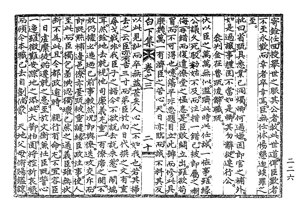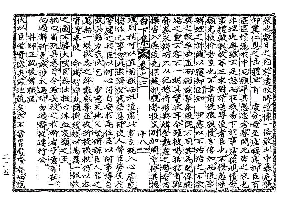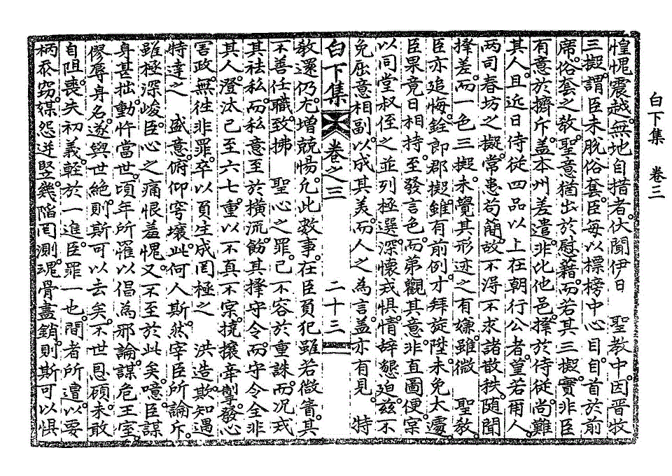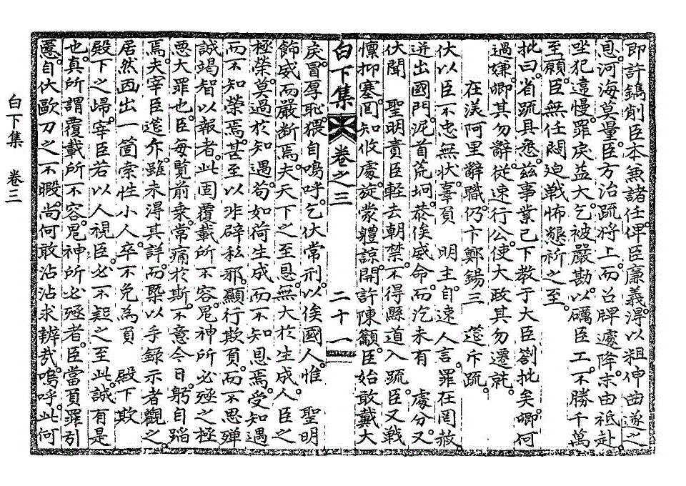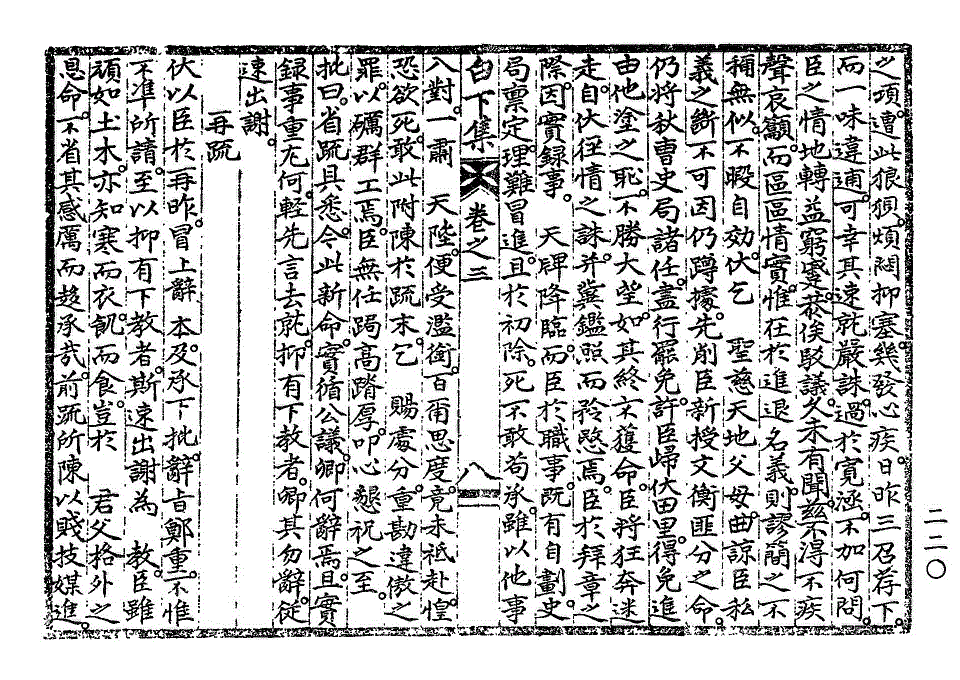 惶愧震越。无地自措者。伏闻伊日 圣教中。因晋牧三拟。谓臣未脱俗套。臣每以标榜中心目。自首于前席。俗套之教。圣意犹出于慰藉。而若其三拟。实非臣有意于挤斥。盖本州差遣。非比他邑。择于侍从。尚难其人。且近日侍从四品以上在朝行公者。堇若尔人。两司春坊之拟。常患苟简。故不得不求诸散秩。随闻择差。而一色三拟。未觉其形迹之有嫌。虽微 圣教。臣亦追悔。铨郎郡拟。虽有前例。才拜旋升。未免太遽。臣果竟日相持。至发言色。而第观其意。非直图便。实以同堂叔侄之并列极选。深怀戒惧。情辞恳迫。玆不免屈意相副。以成其美。而人之为言。盖亦有见。 特教还仍。尤增兢惕。凡此数事。在臣负犯虽若微眚。其不善任职。致拂 圣心之罪。已不容于重诛。而况戒其祛私。而私意至于横流。饬其择守令。而守令全非其人。澄汰已至六七。重以不真不实。挠攘牵掣。发心害政。无往非罪。卒以负生成罔极之 洪造。欺知遇特达之 盛意。俯仰穹壤。此何人斯。然宰臣所论斥。虽极深峻。臣心之痛恨羞愧。又不至于此矣。噫。臣谋身甚拙。动忤当世。顷年所罹以倡为邪论。谋危王室。僇辱身名。遂与世绝。则斯可以去矣。不世恩顾。未敢自阻。丧失初义。轻于一进。臣罪一也。间者所遭。以要柄忝窃。媒怨逆竖。几陷罔测。魂骨尽销。则斯可以惧白下集卷之三 第 228L 页