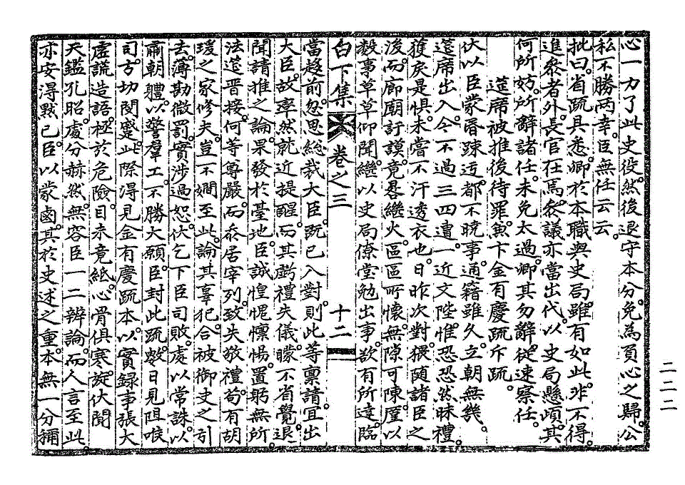 堪此寄而无偾哉。昨于召牌之下。坐犯违敖。谅非得已。而惶蹙一倍。措躬无地。抑臣有区区抚心而惭悼者。臣以屏废畸踪。息望当世。积有年矣。只缘末艺小技。坏却廉义。致有今日之冒进。而其初也。实以遆职召役之 命。真若谅臣咫尺之守。故感激一来。而既来之后。宠命稠叠。一除为刑曹参判。再除为艺文提学。三除为大提学。四除为同 经筵。臣每一闻 命。方寸霣濩。岂不欲循墙逃遁。而始缘庆礼之不敢不参。终因 面教之不敢不承。一入天门。暂登文陛。而匪分之叨。自归次第肃命。至若文衡之尤千万可骇可怪。而不免扬扬冒据。恬若己分事。中心之所自恧。旁观之所窃笑已。不可因仍久处。况臣前席所仰对。惟以史事之完了。为一分自效之义。则所当屏他务谢馀事。专意于编摩。庶几汗青有日。而再次掌试。费却许多日。虽无故赴史局。兼史公干。簿书之分心目而妨笔砚。已不胜其纷如。方拟具此事状。并丐诸任之解免。今又益之以政地之剧。总计一身管带。凡几要务。藉令臣优于任此。其在专责史事之道。固不当若是荐委。况以枯肠渴思。旁酬众务。而更何馀力可以勤史役而不孤委畀之盛意哉。臣之不称无堪。姑不暇论。而即此一事。宜有通变。伏乞 圣慈俯谅臣苦衷。将臣新授铨职及文衡 经筵诸任。即赐镌遆。俾臣得以军衔。专白下集卷之三 第 222L 页
