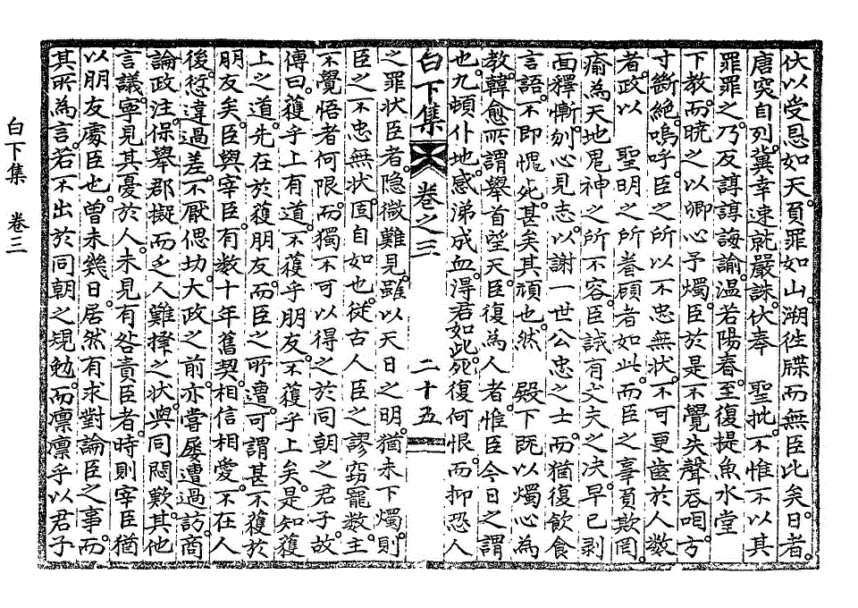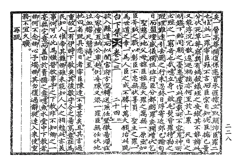 伏以受恩如天。负罪如山。溯往牒而无臣比矣。日者。唐突自列。冀幸速就严诛。伏奉 圣批。不惟不以其罪罪之。乃反谆谆诲谕。温若阳春。至复提鱼水堂 下教。而晓之以卿心予烛。臣于是不觉失声吞咽。方寸断绝。呜呼。臣之所以不忠无状。不可更齿于人数者。政以 圣明之所眷顾者如此。而臣之辜负欺罔。瘉为天地鬼神之所不容。臣诚有丈夫之决。早已剥面释惭。刎心见志。以谢一世公忠之士。而犹复饮食言语。不即愧死。甚矣其顽也。然 殿下既以烛心为教。韩愈所谓举首望天。臣复为人者。惟臣今日之谓也。九顿仆地。感涕成血。得君如此。死复何恨。而抑恐人之罪状臣者。隐微难见。虽以天日之明。犹未下烛。则臣之不忠无状。固自如也。从古人臣之谬窃宠数。主不觉悟者何限。而独不可以得之于同朝之君子。故传曰。获乎上有道。不获乎朋友。不获乎上矣。是知获上之道。先在于获朋友。而臣之所遭。可谓甚不获于朋友矣。臣与宰臣。有数十年旧契。相信相爱。不在人后。愆违过差。不厌偲切。大政之前。亦尝屡遭过访。商论政注。保举郡拟而乏人难择之状。与同闷叹。其他言议。宁见其忧于人。未见有咎责臣者。时则宰臣犹以朋友处臣也。曾未几日。居然有求对论臣之事。而其所为言。若不出于同朝之规勉。而凛凛乎以君子白下集卷之三 第 229L 页