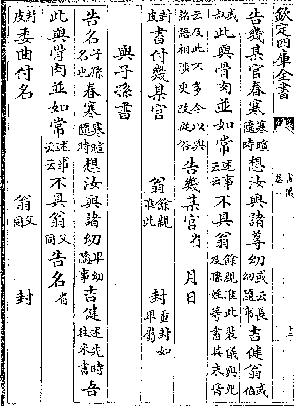告几某官春寒(寒暄/随时)想汝与诸尊幼(或云长/幼随事)吉健翁(或/伯)(或/叔)此与骨肉并如常(述事/云云)不具翁(馀亲准此裴仪与儿/及孙侄等书其末皆)