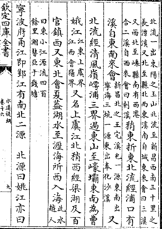 (南流又一源出县南之五路岭曰南溪东北流至县/城南合而东稍北五十里有一水南自义乌西北之)(戚村桥北流来会又东北流经白马桥又东北经诸/暨县南境曰上西江又东北至丫口有上东江东南)