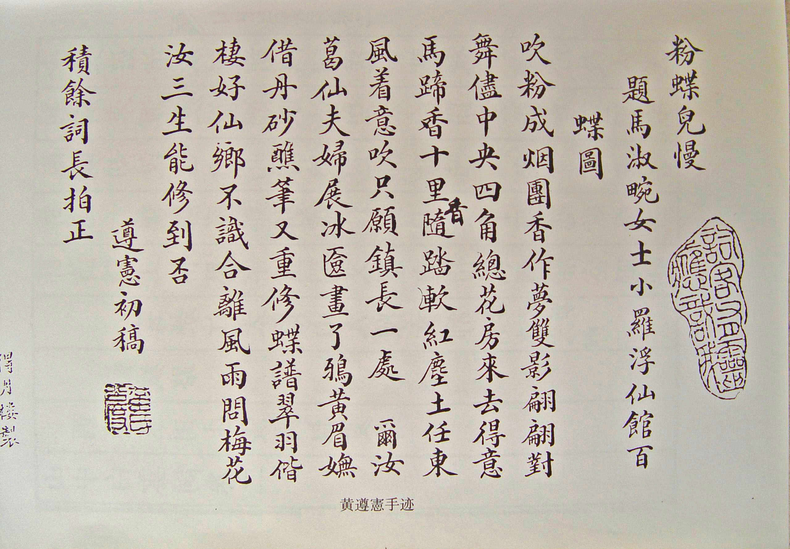 黄遵宪(1848-1905) 字公度。广东嘉应州(今梅县)人。光绪二年(1876)举人。历任驻日使馆参赞、驻美国旧金山总领事、驻英使馆参赞、驻新加坡总领事、江宁洋务局总办。擢湖南长宝盐法道,署按察使,参加变法维新运动。充出使日本大臣,以病未行,戊戌政变作,罢官回籍。工诗,为晚清诗界革命领袖。能熔铸新理想以入旧风格,千变万化,元气淋漓,卓然大家。亦能词,传世甚罕。有《人境庐诗草》、《日本杂事诗》,其词见《近代词钞》。